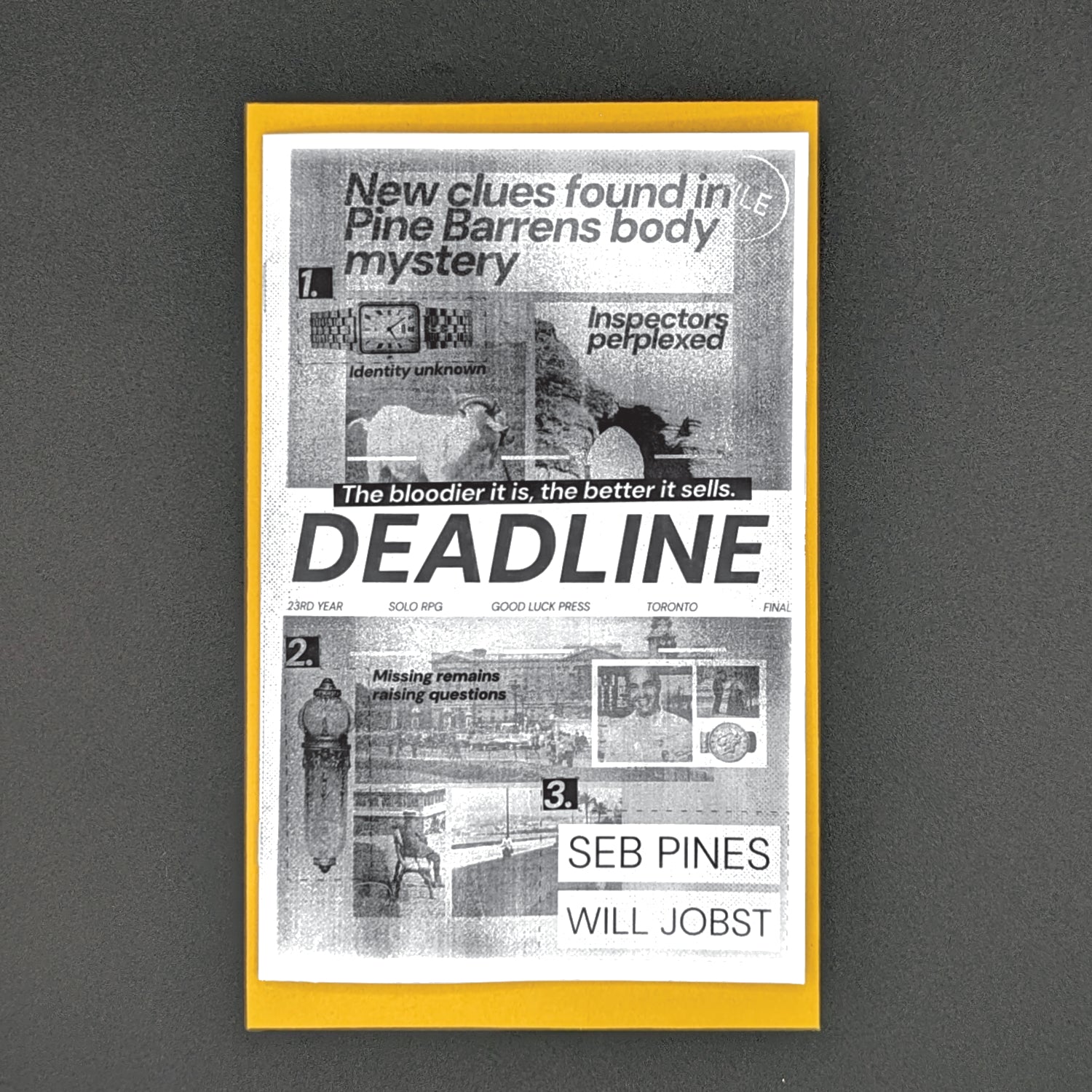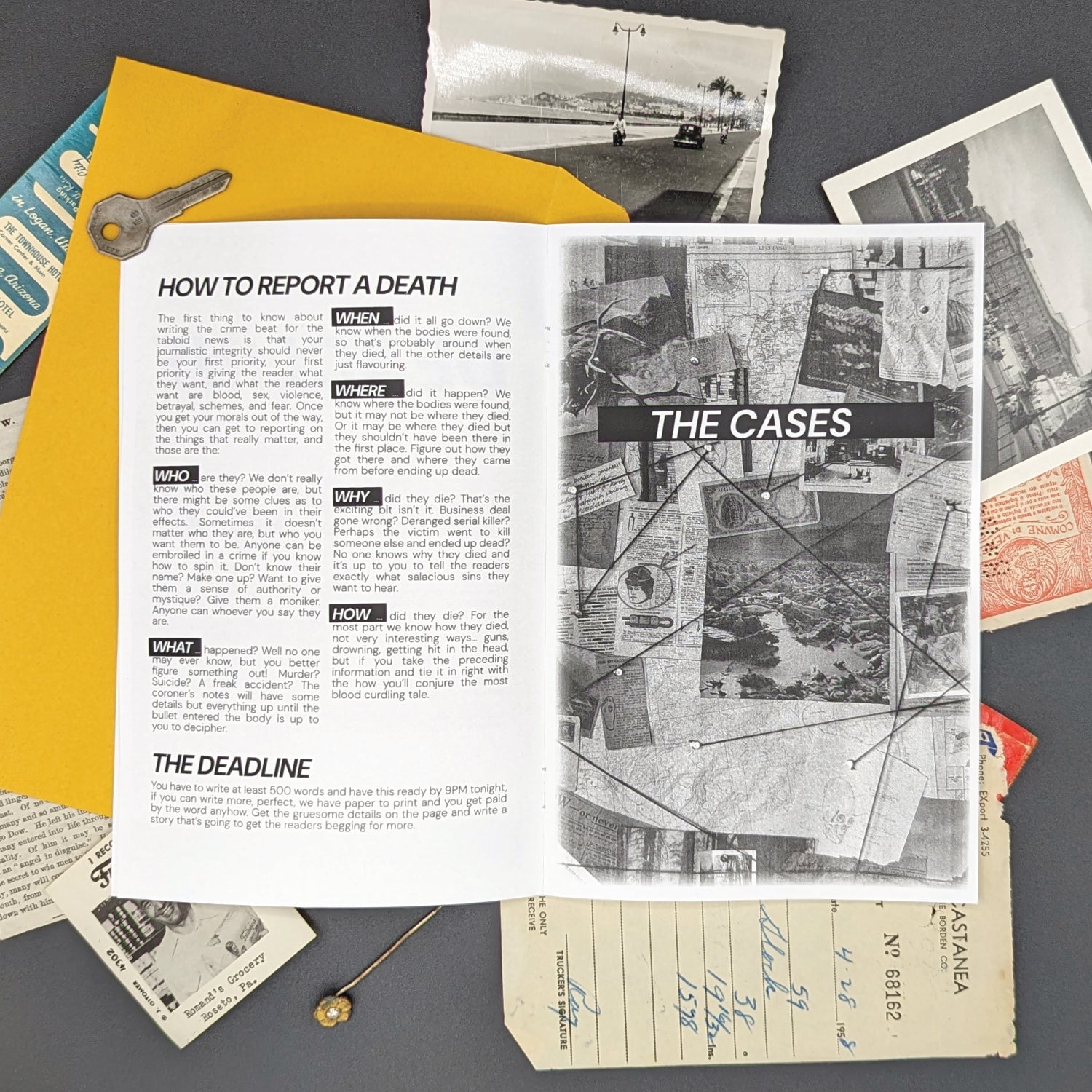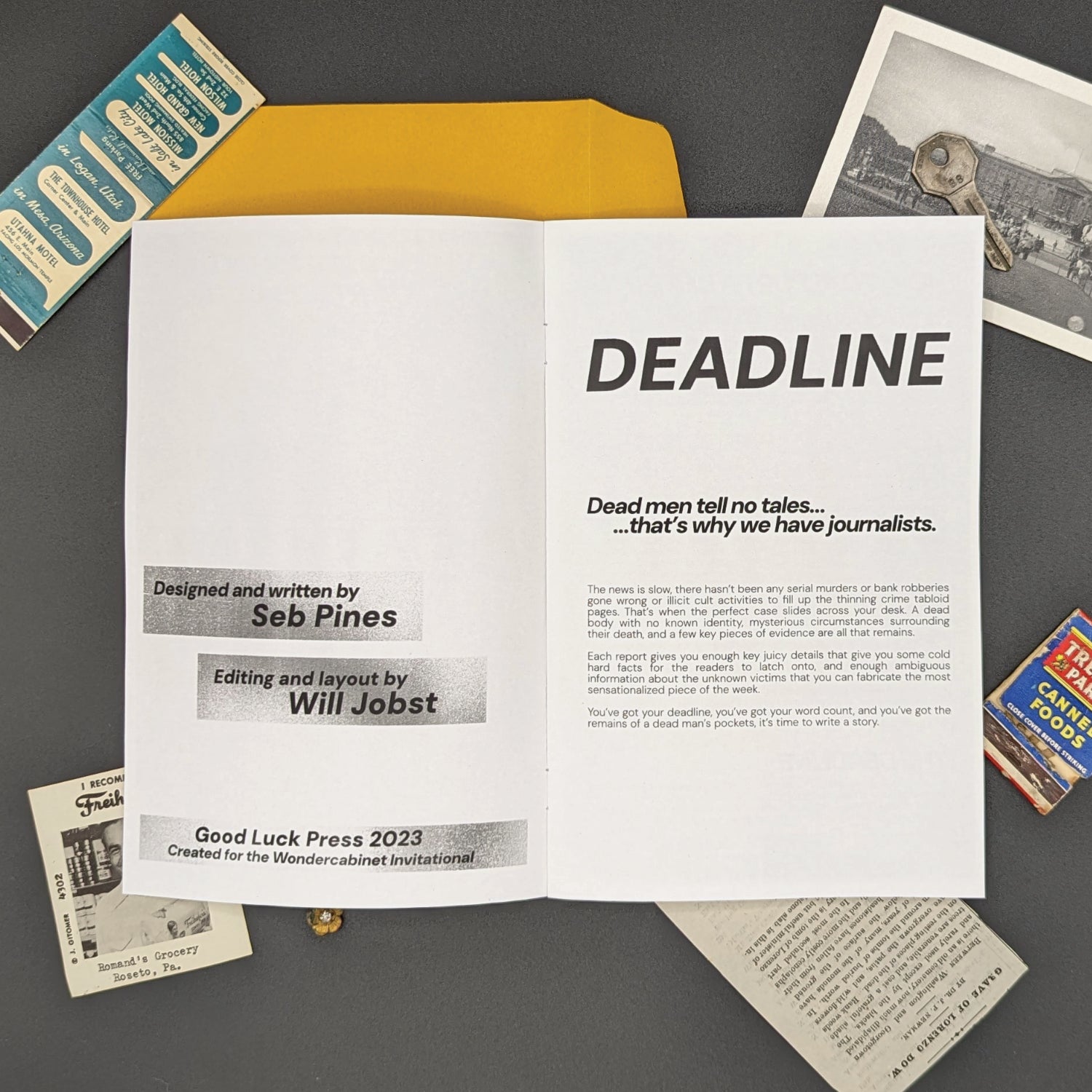 Deadline contains 6 cases of unknown victims, strange circumstances around their deaths, and the few personal effects they've left behind. It's up to you to write their endings.