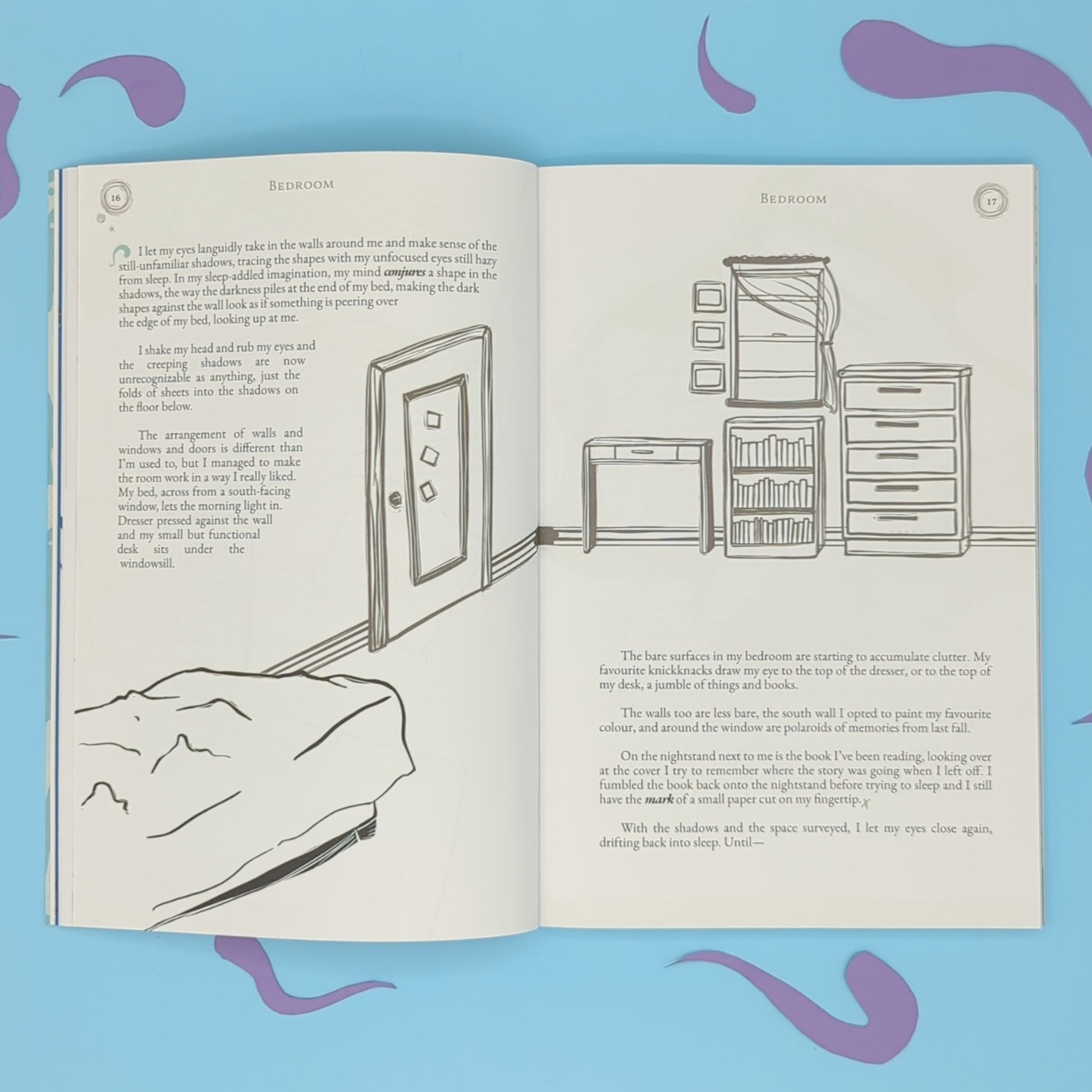 Taking on the role of the embodied narrator you will wander through your new strange home at night. Conjuring spectres and finding they summon parts of your past along with them. Read, write, and draw in this curated solitary experience of a sleepless night in a haunted house.